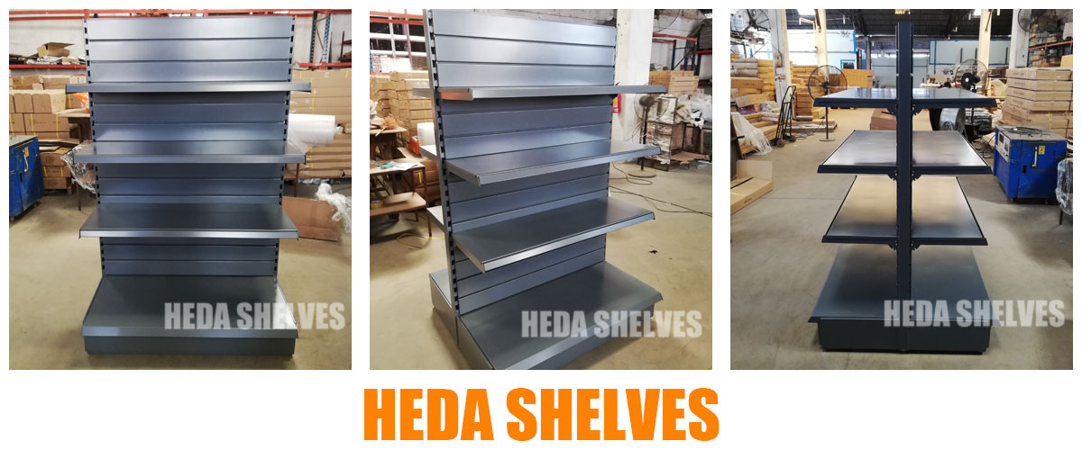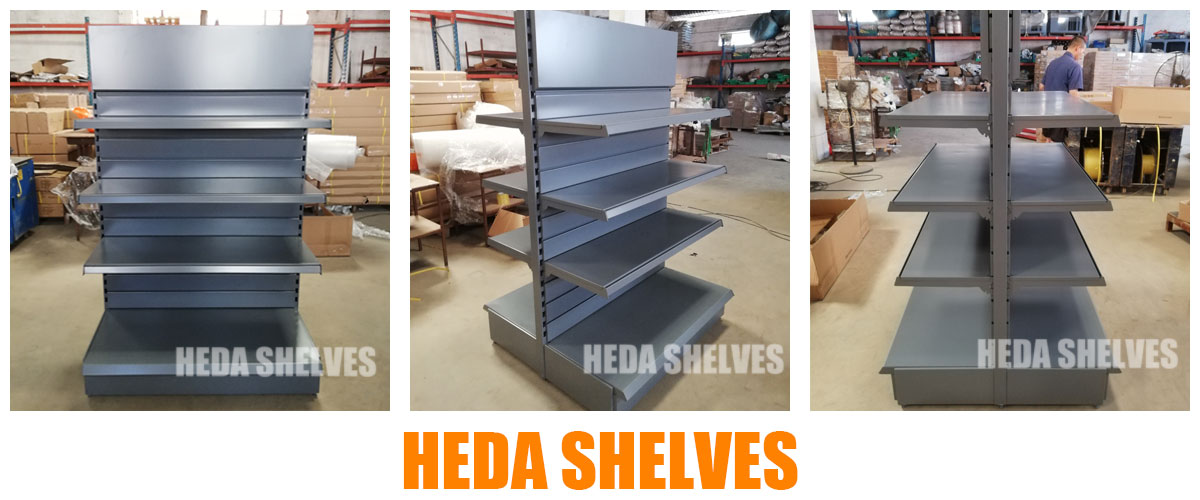 A customer from the Philippines purchased this gray supermarket gondola display shelf from Heda Shelves, which comes in 2 styles, with and without billboards.